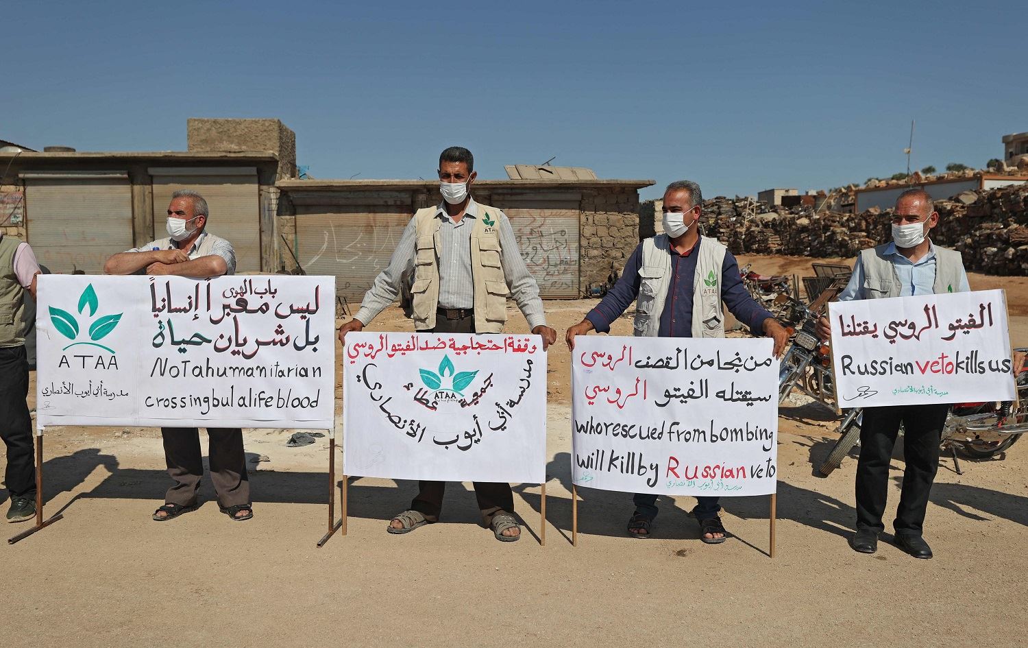 Aid workers form a human chain at the Bab al-Hawa border crossing between Syria's Idlib and Turkey, calling on the UN Security Council to keep the border open to aid, on July 2, 2021. Photo: Omar Haj Kadour/AFP