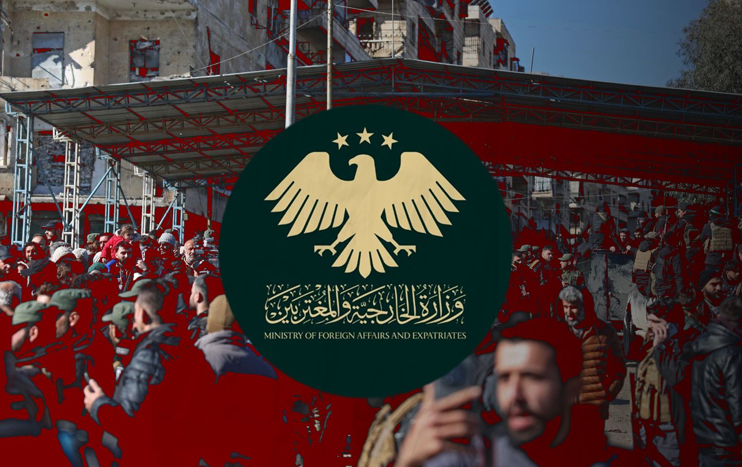 Syrian foreign ministry logo and photo of people leaving Kurdish quarters in Aleppo. Graphic: Rudaw
