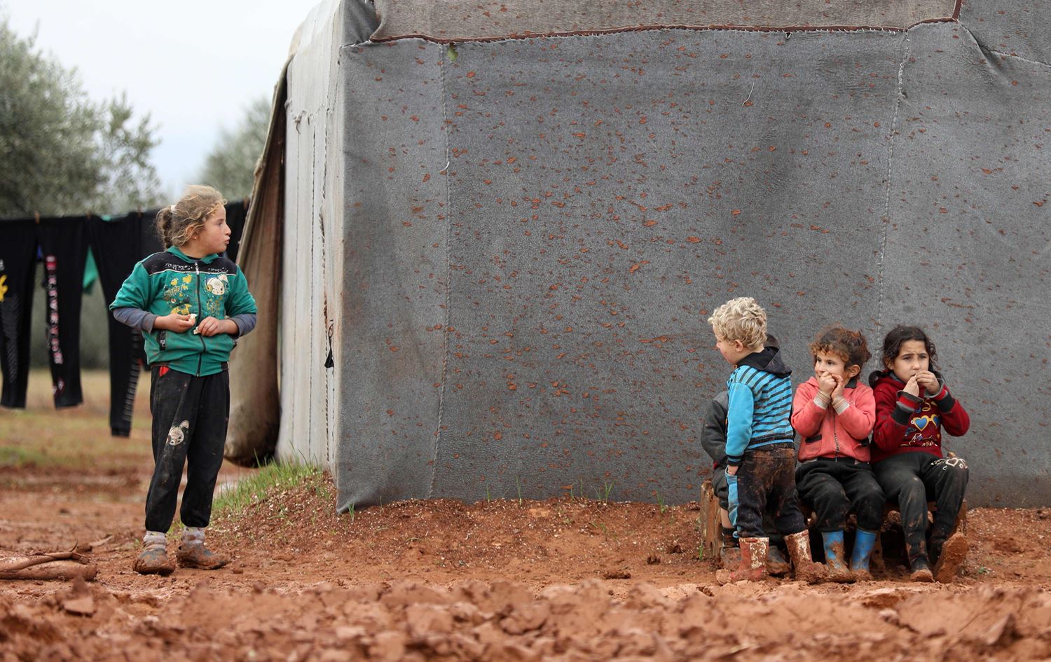 Syrian children, who fled air strikes in their hometown, are pictured near tents at an informal camp for displaced people where they live with their families in northern Syria's Idlib province on January 7, 2020. Photo: Omar Haj Kadour/AFP
