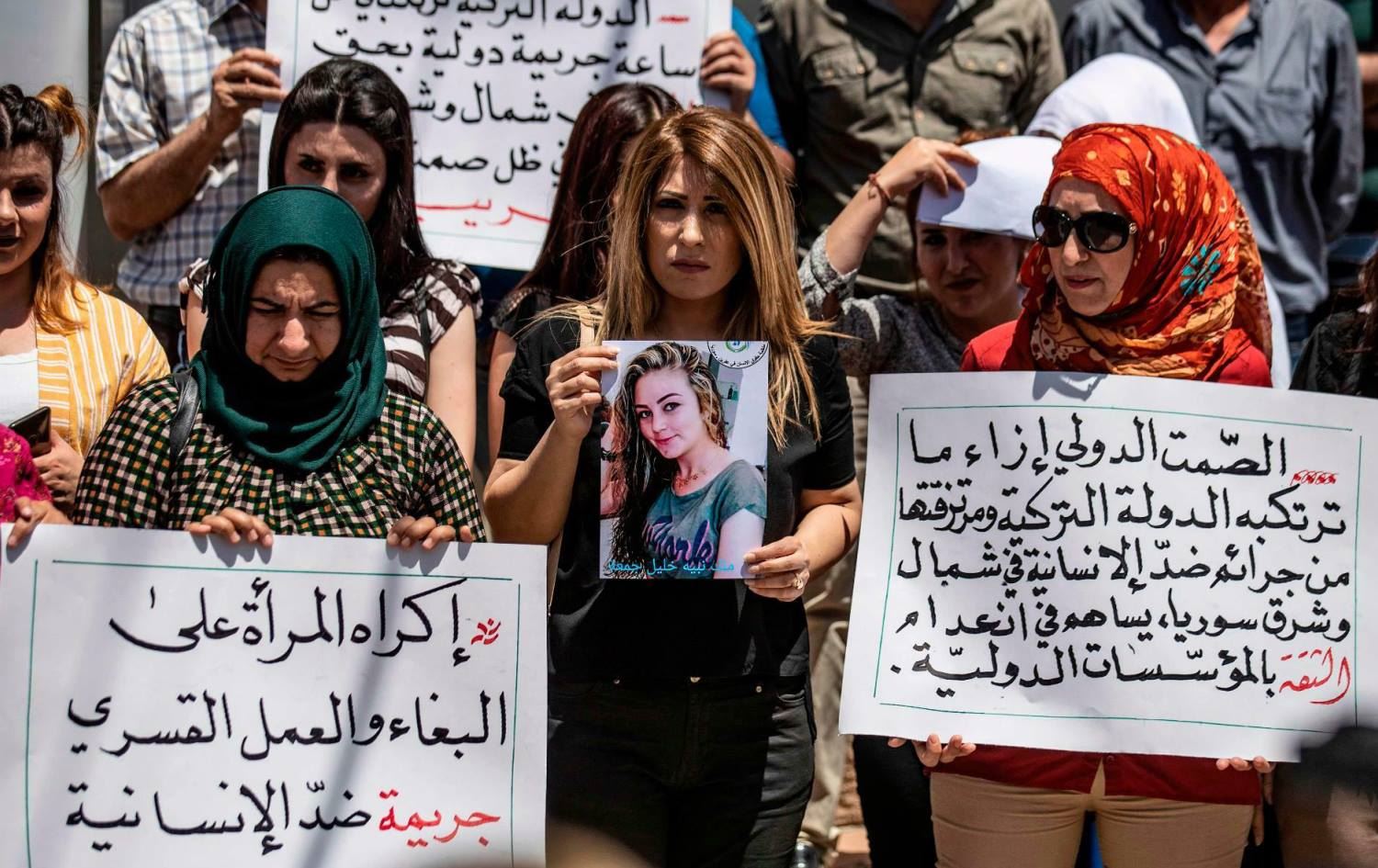 Displaced women from Afrin hold placards during a demonstration to condemn violations by local Turkish-backed factions in front of the UN office in the city of Qamishli on June 1, 2020. Photo: Delil Souleiman / AFP