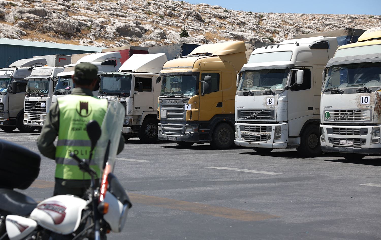 A convoy of trucks carrying humanitarian aid is seen parked after crossing the Syrian Bab al-Hawa border crossing with Turkey, on July 10, 2023. Photo: Omar Haj Kadour/AFP
