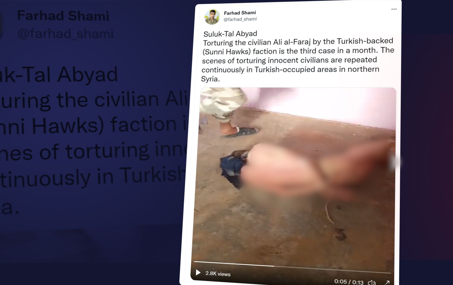 A tweet from head of the SDF’s media office Farhad Shami with video of alleged torture of a civilian by Turkish-backed forces in Syria. Graphic: Rudaw