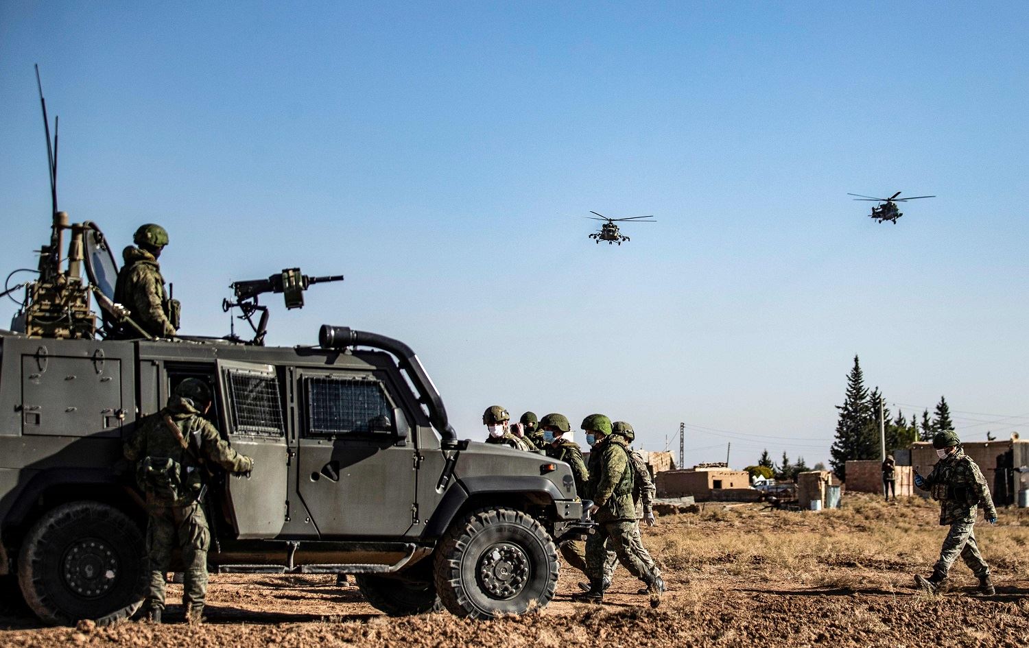 Russian military helicopters fly by soldiers and military vehicles during a joint Russian-Turkish patrol in the eastern countryside of the town of Darbasiyah near the border with Turkey in Syria's northeastern Hasaka province on December 7, 2020. Photo: Delil Souleiman/AFP