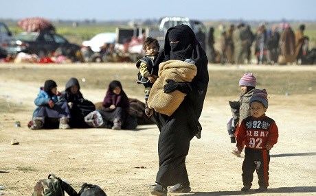 Iraqi and Syrian women and children prepared to make the long journey north to a Kurdish-held camp for the displaced, after spending the night in tents.