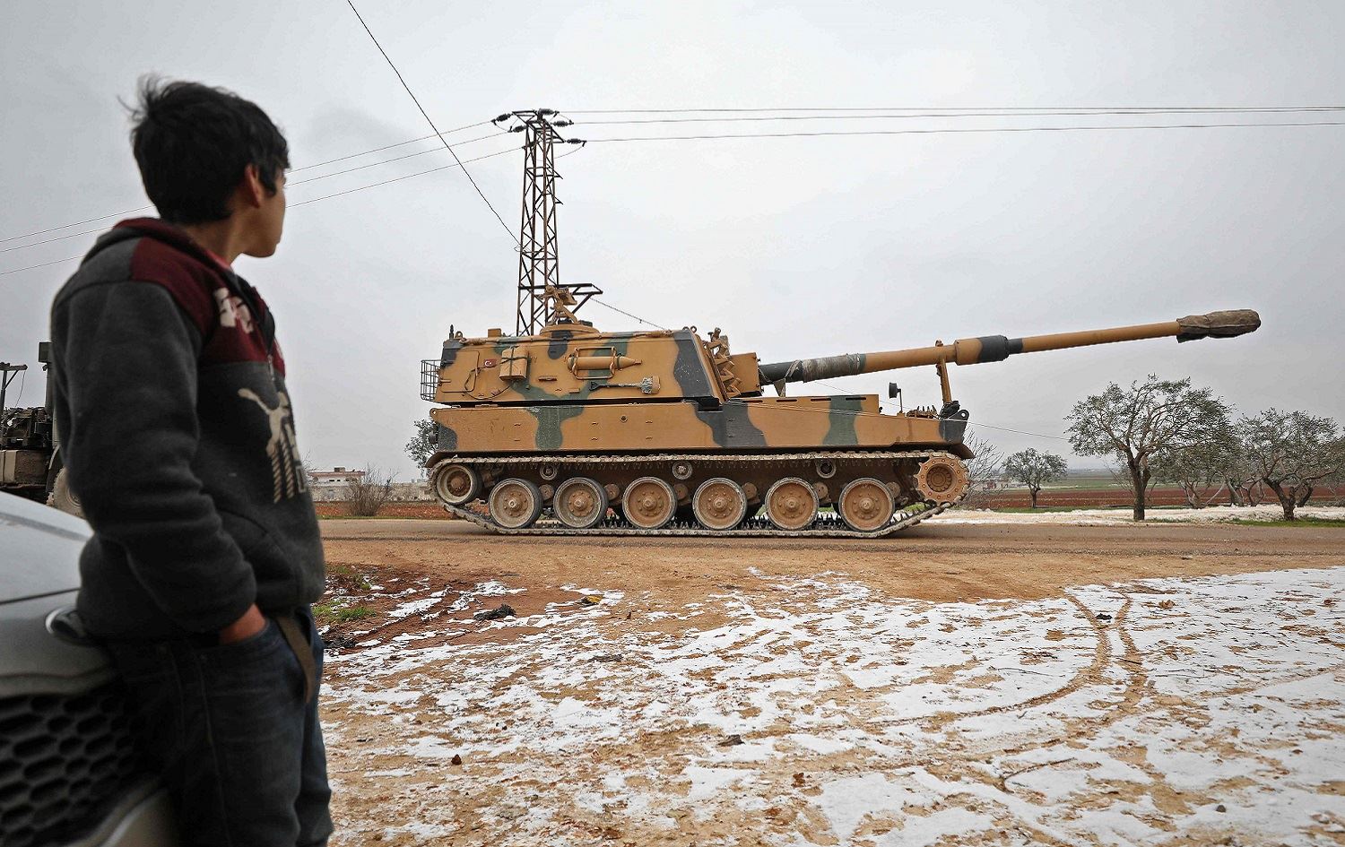 A child gazes at a Turkish 155mm self-propelled artillery gun in the town of Binnish in Syria’s northwestern province of Idlib, near the Syria-Turkey border, February 12, 2020. Photo: Omar Haj Kadour / AFP