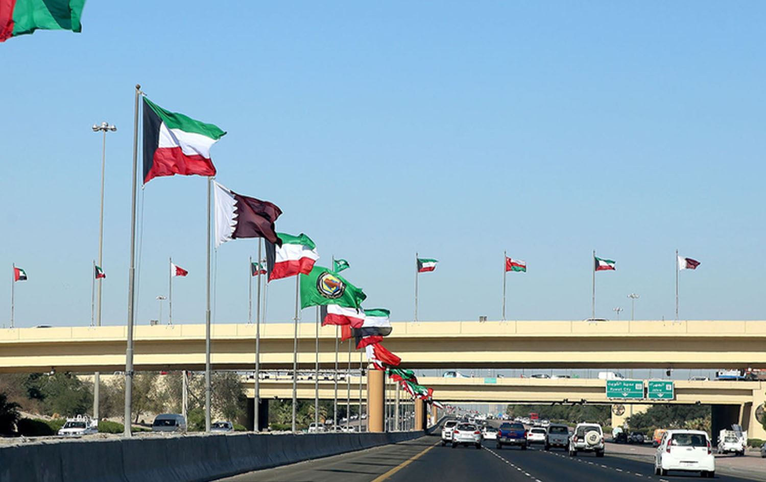 Flags of the member states of the Gulf Cooperation Council (GCC) are seen on a highway in Kuwait City on December 3, 2017. Photo: AFP
