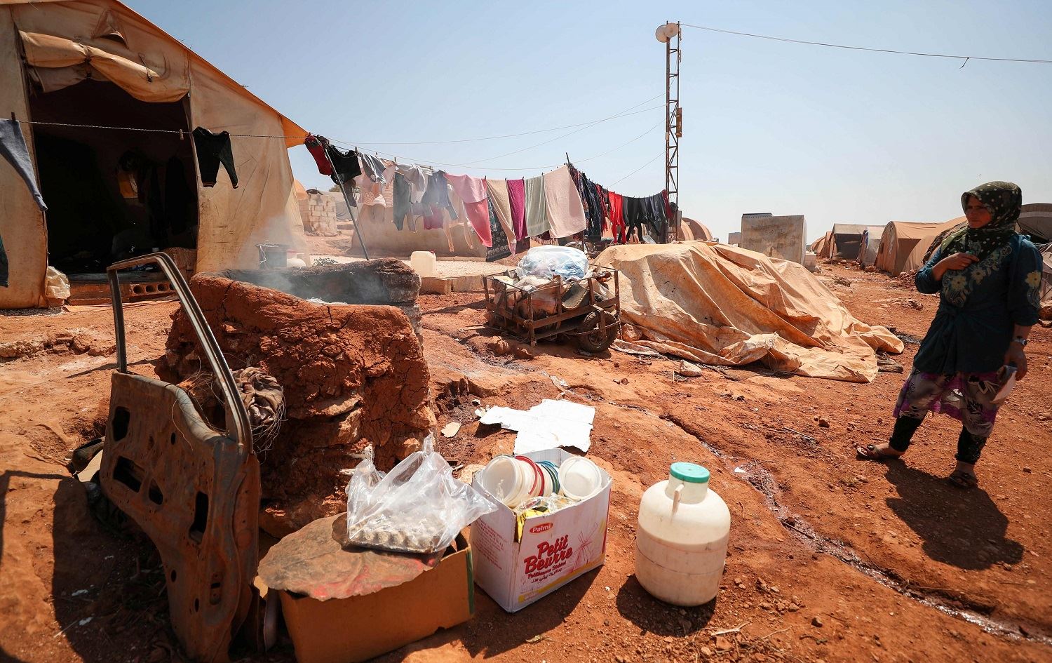 A displaced Syrian woman, stands next to her tent at a camp for displaced Syrians from Idlib and Aleppo provinces, near the town of Maaret Misrin in Syria's northwestern Idlib province on July 11, 2020. Photo: Omar Haj Kadour/AFP