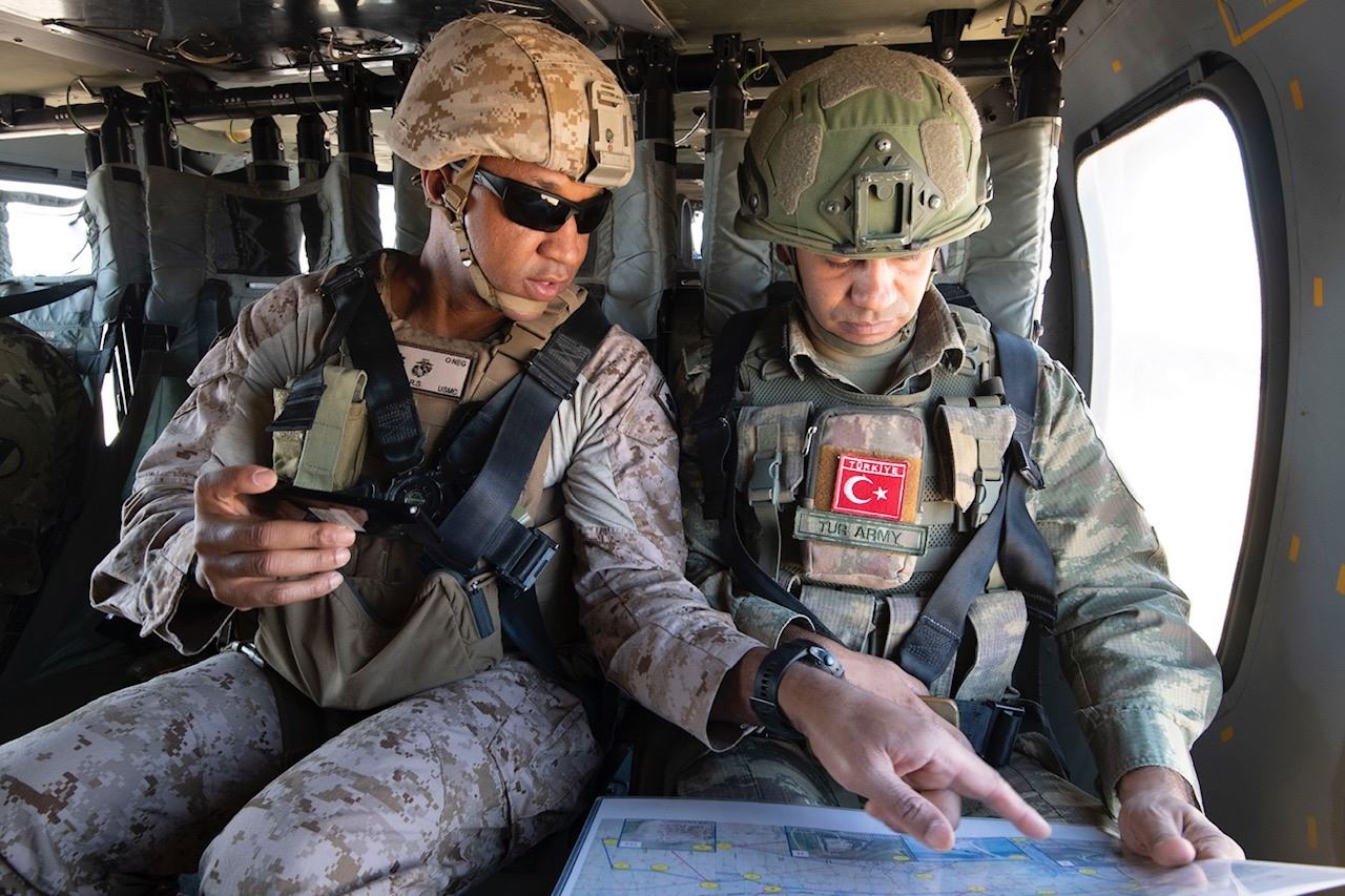 US Marine Corps Lt. Col. Roe Lemons and Turkish Army Maj. Mahmijt Ceylan discuss areas during a joint aerial patrol of the security mechanism zone over northeast Syria in a Louisiana National Guard UH-60 Black Hawk helicopter, September 12, 2019. Photo: US Army / Staff Sgt. Andrew Goedl via CENTCOM
