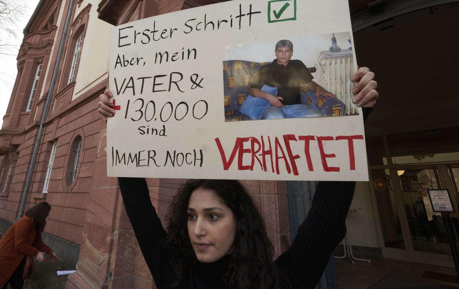Serda Alshehabi holds a banner in front of the Higher Regional Court in Koblenz, Germany, during an earlier part of the trial on February 24, 2021. The translation reads, "First step. But, my father and 130,000 are still under arrest." Photo: Thomas Frey/AP