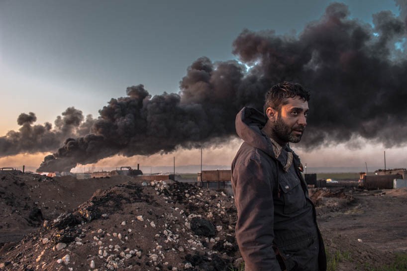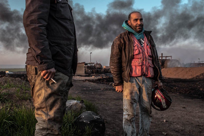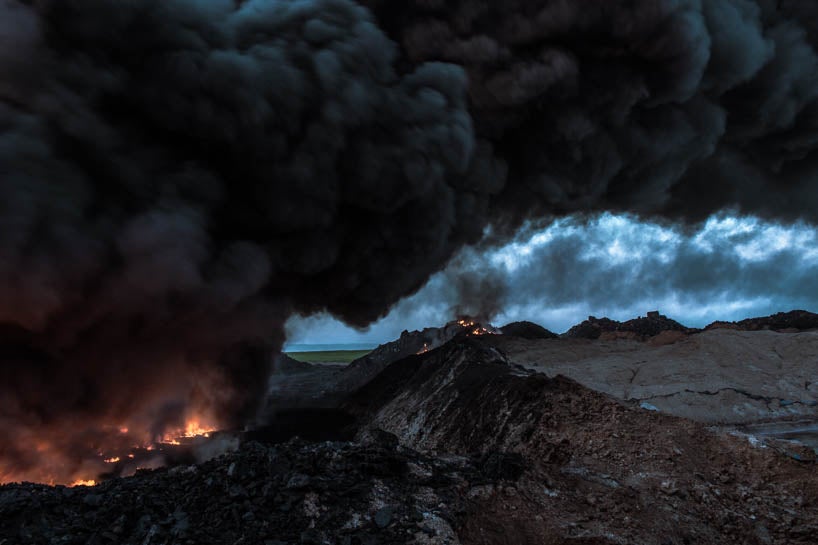 Ali turns back to work under a low-hanging moon. A dirt-streaked dog scavenges for food, blending in with the background as a roar of fire sends up a new plume of choking smoke to obscure the setting sun.