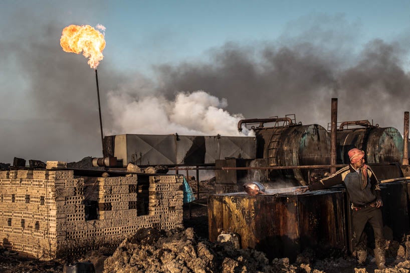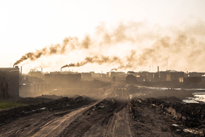 Black and white smoke belches out of a series of bubbling tanks and pits, operated by a gaggle of grease-smeared men and boys. Several times a day, the workers set alight the waste, sending a plume of jet black, acrid smoke into the sky where it catches the wind and trails across the countryside.