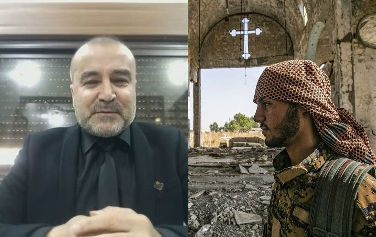 Pastor Naim Youssef (left) speaking to Rudaw on March 12, 2025 and a file photo of the SDF-affialited Khabour Guards Assyrian members. Credit: AFP. Graphic: Rudaw
