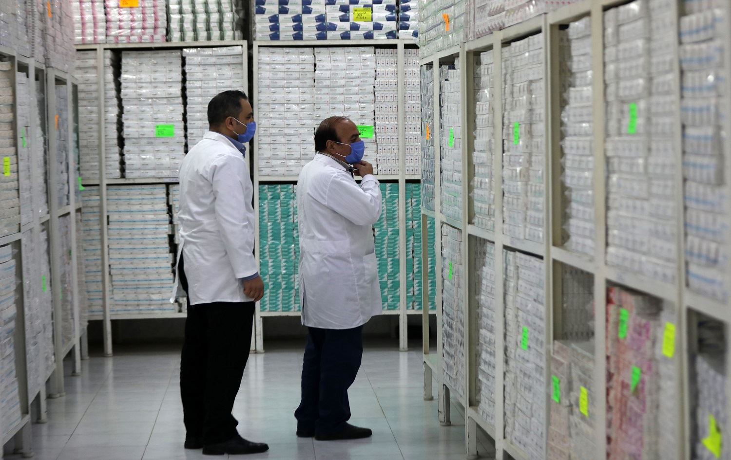 Employees of a pharmaceutical factory in Homs, central Syria check stock of hydroxychloroquine, used in the country to prevent or cure COVID-19, on April 28, 2020. Photo: Louai Behsara / AFP