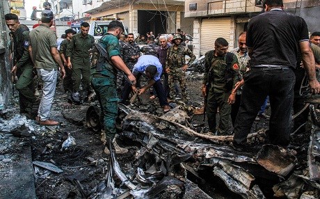 Kurdish security forces inspect the wreckage of a rigged car which detonated outside the Syriac Orthodox Church of the Virgin Mary in the predominantly Christian neighbourhood of al-Wasti in the Kurdish-majority city of Qamishli in northeast Syria on July 11, 2019. Photo: Muhammed Ahmad | AFP