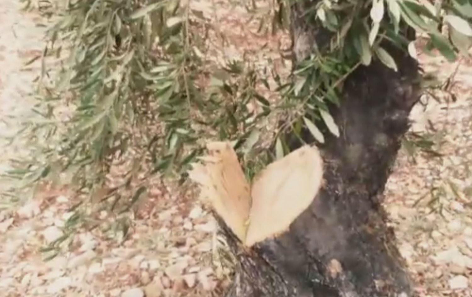 Olive tree logged in a Kurdish farmer's olive field in Afrin. Photo: screenshot from video submitted to Rudaw