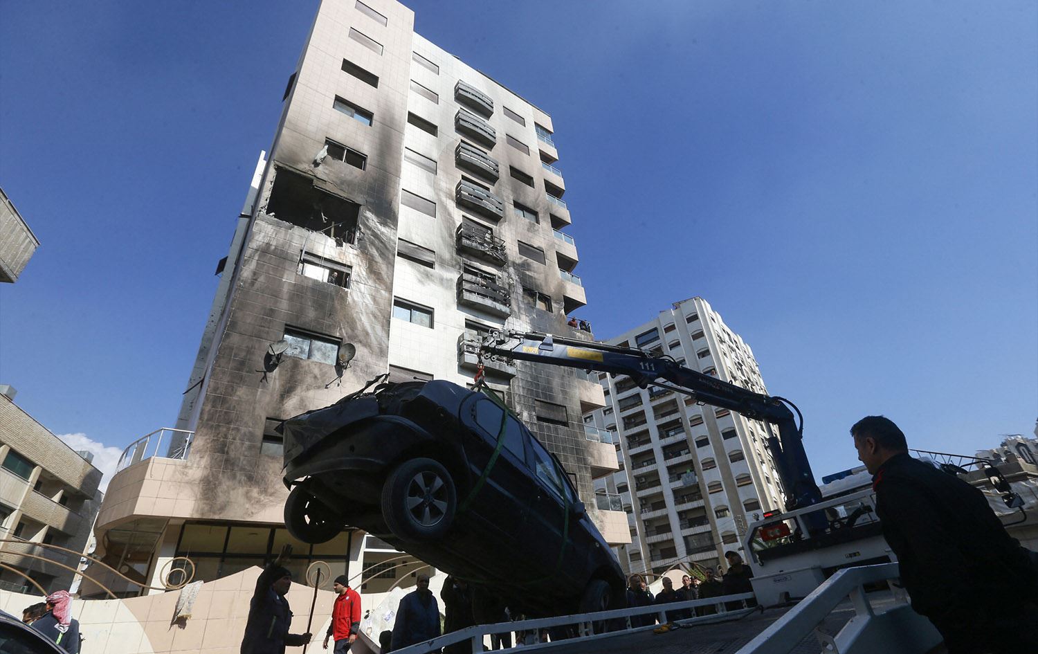 A car is removed from the area where reported Israeli air strikes targeted a residential building in the Kafr Sousa district of the Syrian capital Damascus on February 21, 2024. Photo: Louai Beshara/AFP