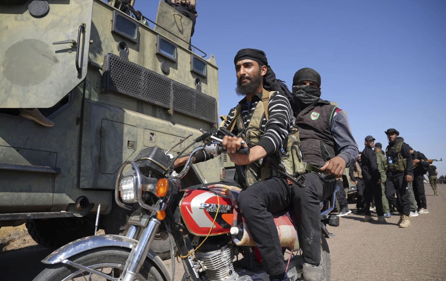 Two fighters from the Sunni Bedouin clans, ride their motorcycle as they pass by Syrian government security forces deployed on the outskirts of the Suwayda province where clashes erupted between Druze militias and Sunni Bedouin clans, southern Syria, Monday, July 14, 2025. Photo: Malek Khattab/AP