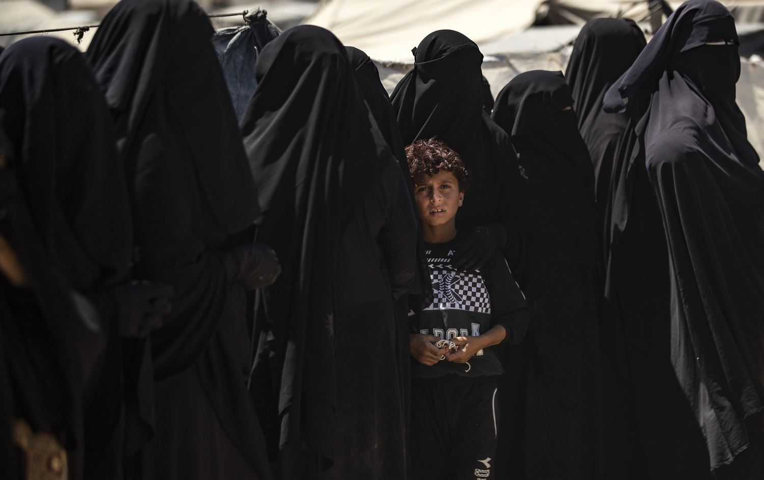 A boy looks on as he stands in line with women to receive aid at al-Hol camp in in the Hasaka province of northeast Syria on August 18, 2020. Photo: Delil Souleiman / AFP