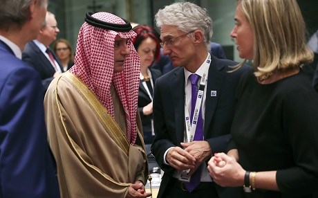 Saudi Arabia's Foreign Minister Adel al-Jubeir, left, talks to UN Under-Secretary-General for Humanitarian Affairs Mark Lowcock, centre, and European Union foreign policy chief Federica Mogherini, right, during a Syria donors conference at the European Council headquarters in Brussels on March 14, 2019. Photo: Francisco Seco/AP
