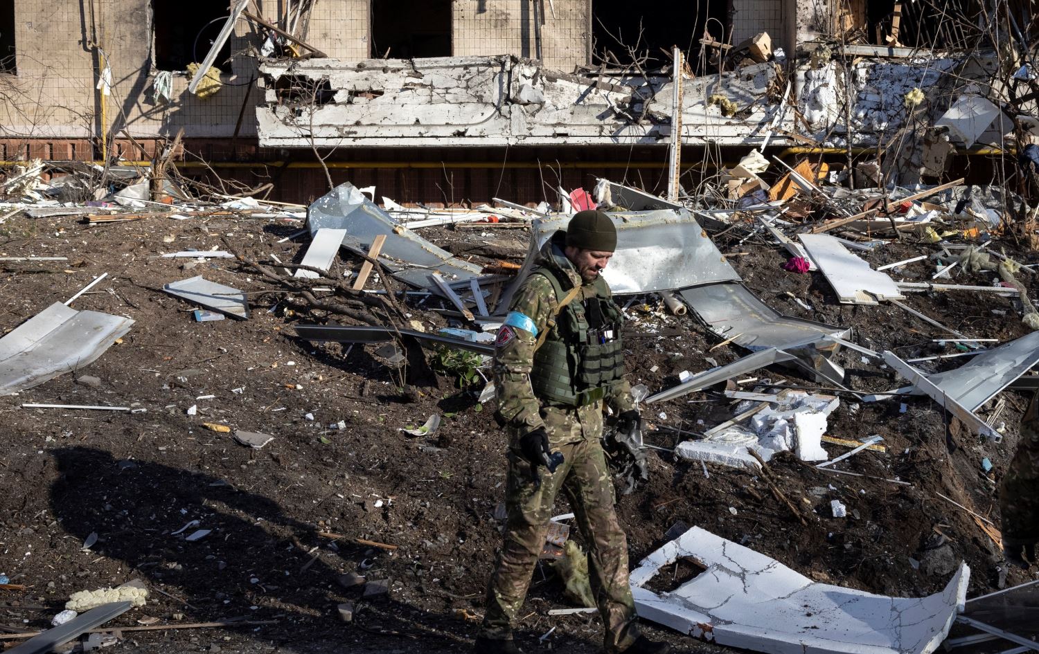 A Ukraine soldier inspects the rubble of a destroyed apartment building in Kyiv on March 15, 2022, after strikes on residential areas killed at least two people. Photo: Fadel Senna/AFP