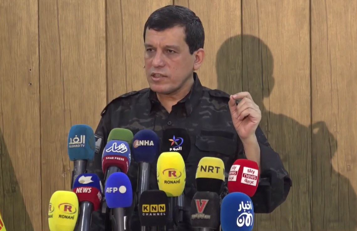 Mazloum Abdi, General Commander of the Kurdish-led Syrian Democratic Forces (SDF), speaks to reporters in Hasaka on July 15, 2022. Photo: SDF media