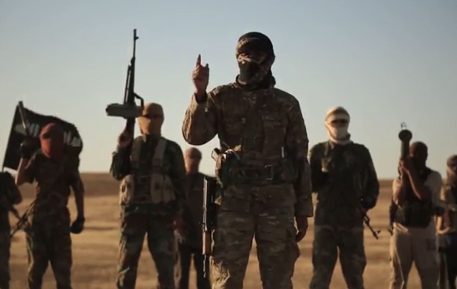 A group of ISIS militants in the border area between Iraq and Syria threatening to rise up again, in video published by ISIS in September 2019.
