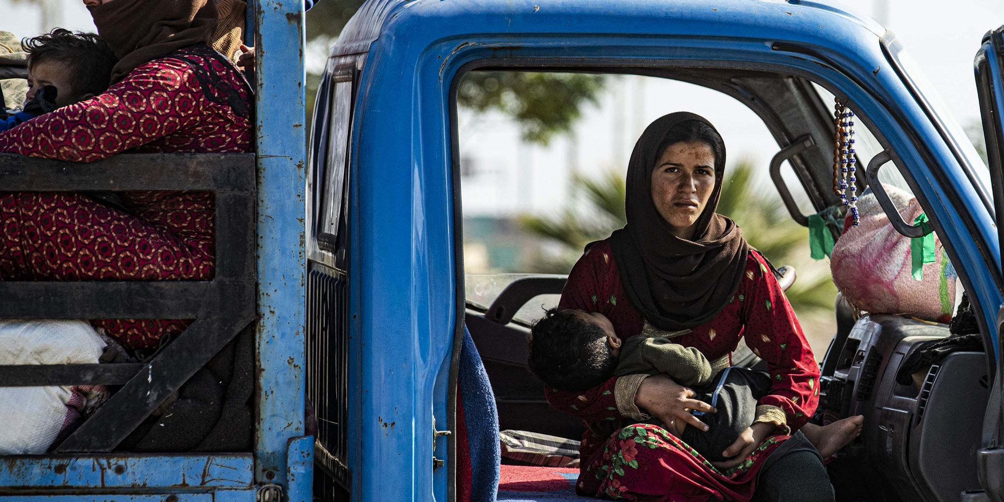 Syrian families fleeing the battle zone between Turkey-led forces and Kurdish fighters from the Syrian Democratic Forces (SDF) on the outskirts of Hasakeh on October 15, 2019. Photo:Delil Souleiman/AFP