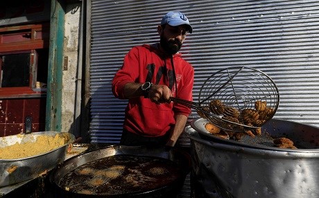 "We reopened almost two weeks ago," the 33-year-old said, as one of his employees spooned balls of yellow chickpea mixture from a battered, bullet-pierced vat and dipped them in searing oil.