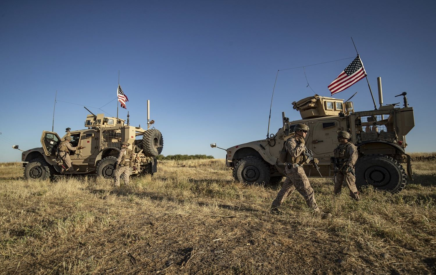 A US military convoy makes a stop in the western countryside of the northeastern Syrian town of al-Malikiyah (Derik), as it patrols Kurdish towns near the border with Turkey, on June 7, 2020. Photo: Delil Souleiman/ AFP