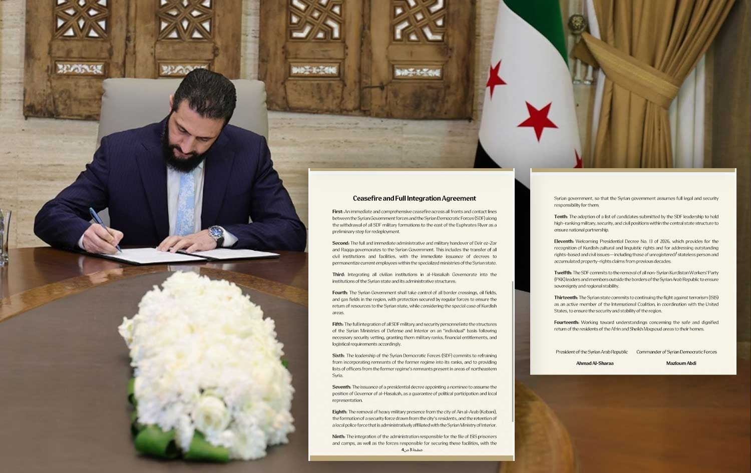 An immediate and comprehensive ceasefire across all fronts and contact lines between the Syrian Government forces and the Syrian Democratic Forces (SDF), along with the withdrawal of all SDF military formations to the east of the Euphrates River as a preliminary step for redeployment.