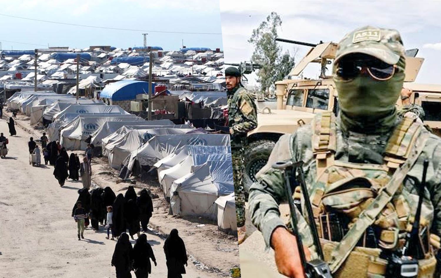 On the left: Syria's al-Hol camp; on the right: members of the Syrian Democratic Forces (SDF). Photos: handout/SDF; Graphic: Ahmed Bahram/Rudaw