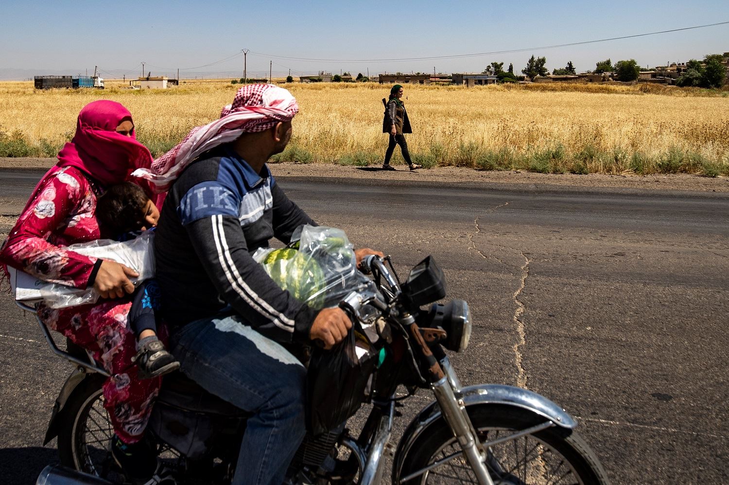 A family ride a motorcycle past a Kurdish female volunteer, from the newly formed Community Protection Forces, as she patrols a wheat field in the countryside east of Qamishli in Syria's northeastern Hasakah province. Photo: Delil Souleiman/ AFP