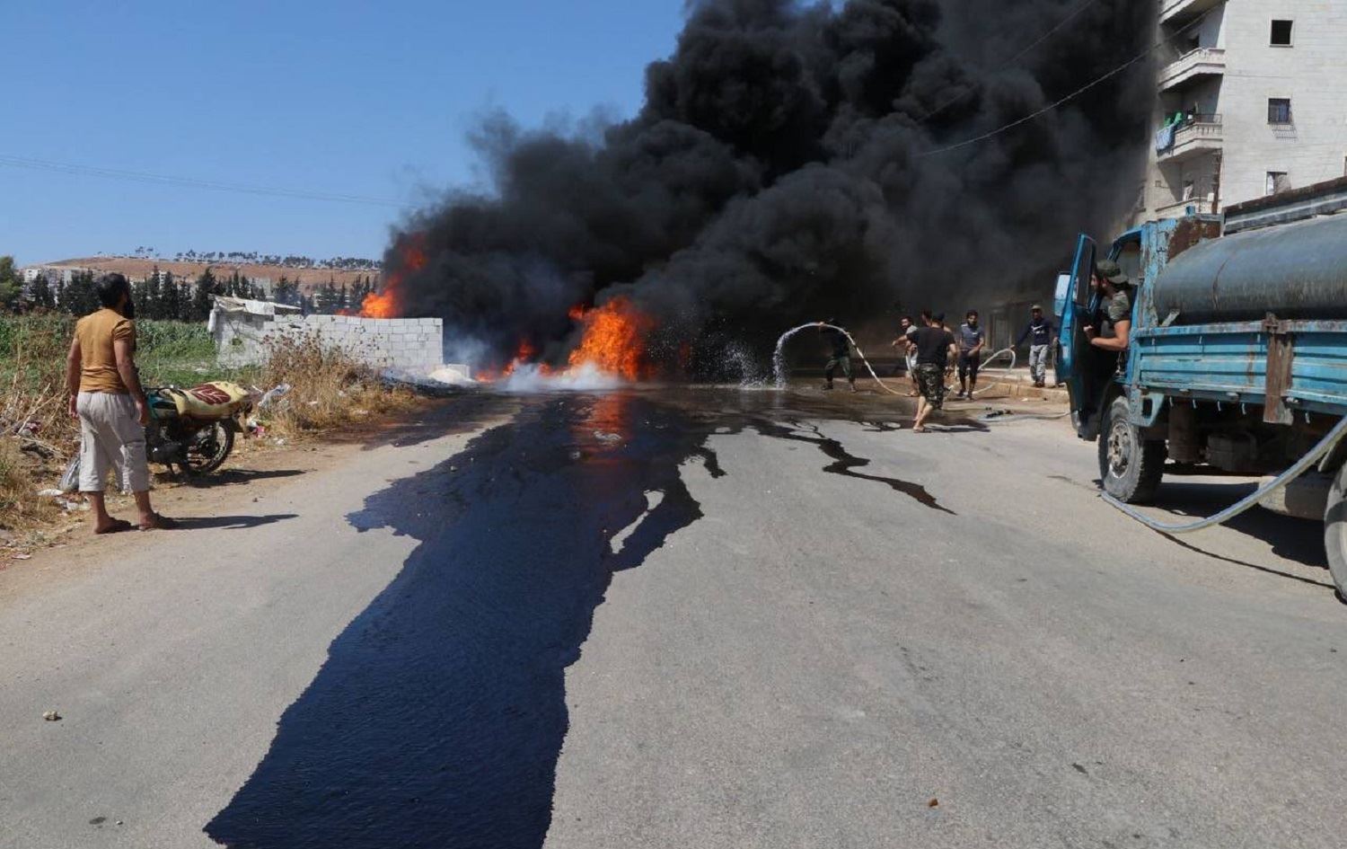 Thick, black smoke rises from the site of a deadly rocket attack on Afrin, Syria on August 18, 2021. Photo: handout/Turkey defence ministry