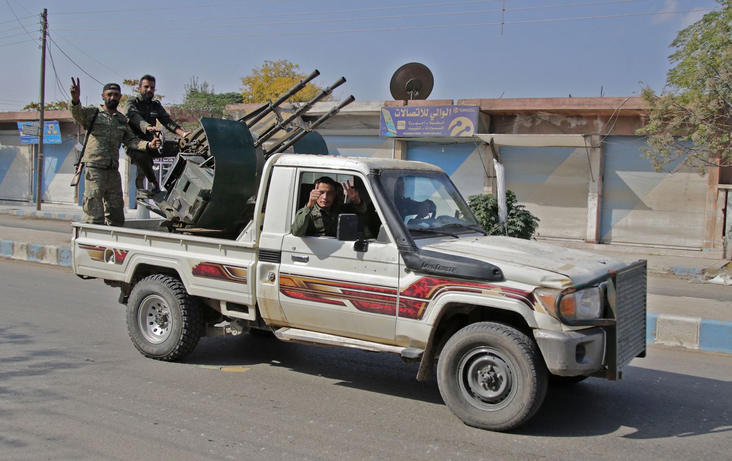 Turkish-backed Syrian fighters ride in the back of a pick up truck in the Syrian border town of Tal Abyad on October 18, 2019, a day after a ceasefire was announced. Photo: Bakr Alkasem/AFP