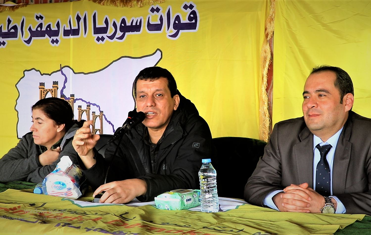SDF General Commander Mazloum Abdi (middle) speaks to the people in Deir ez-Zor. Date: December 17, 2021. Photo: SDF