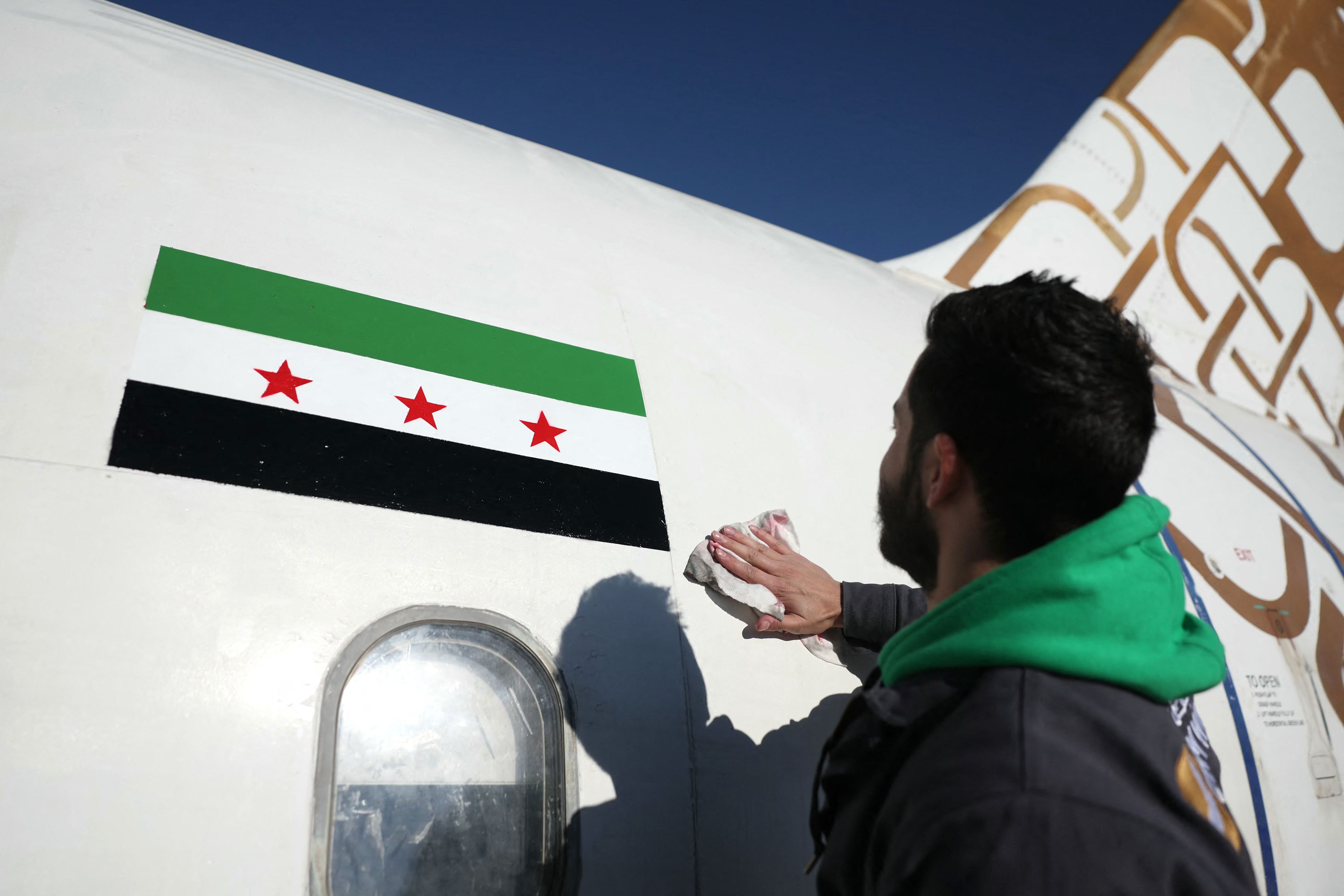 A man cleans after painting the flag of the Syrian revolution on a Cham Wings Airlines Airbus A320-231 aircraft at Damascus international airport as the new Syrian authorities prepare to reopen it, on December 16, 2024. Photo: AFP