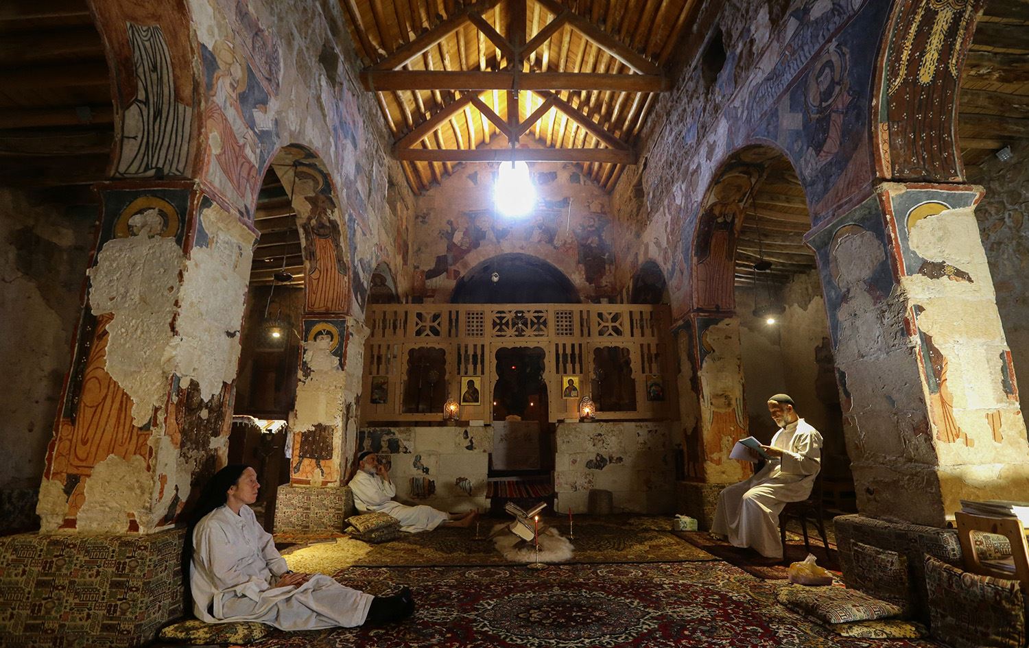 Monks and nuns sit in prayer and contemplation at Deir Mar Moussa Al-Habashi in Syria on June 11, 2022. Photo: Louai Beshara/AFP