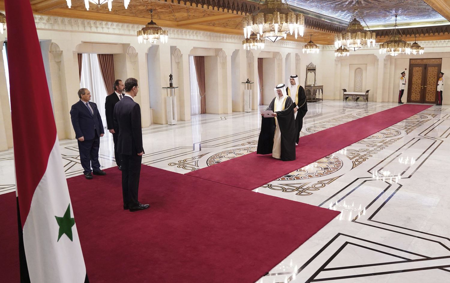 Bahrain's new Ambassador to Syria Waheed Mubarak Sayyar, center, presents his credentials to Syrian President Bashar al-Assad, third left, in Damascus, on June 19, 2022. Photo: SANA via AP