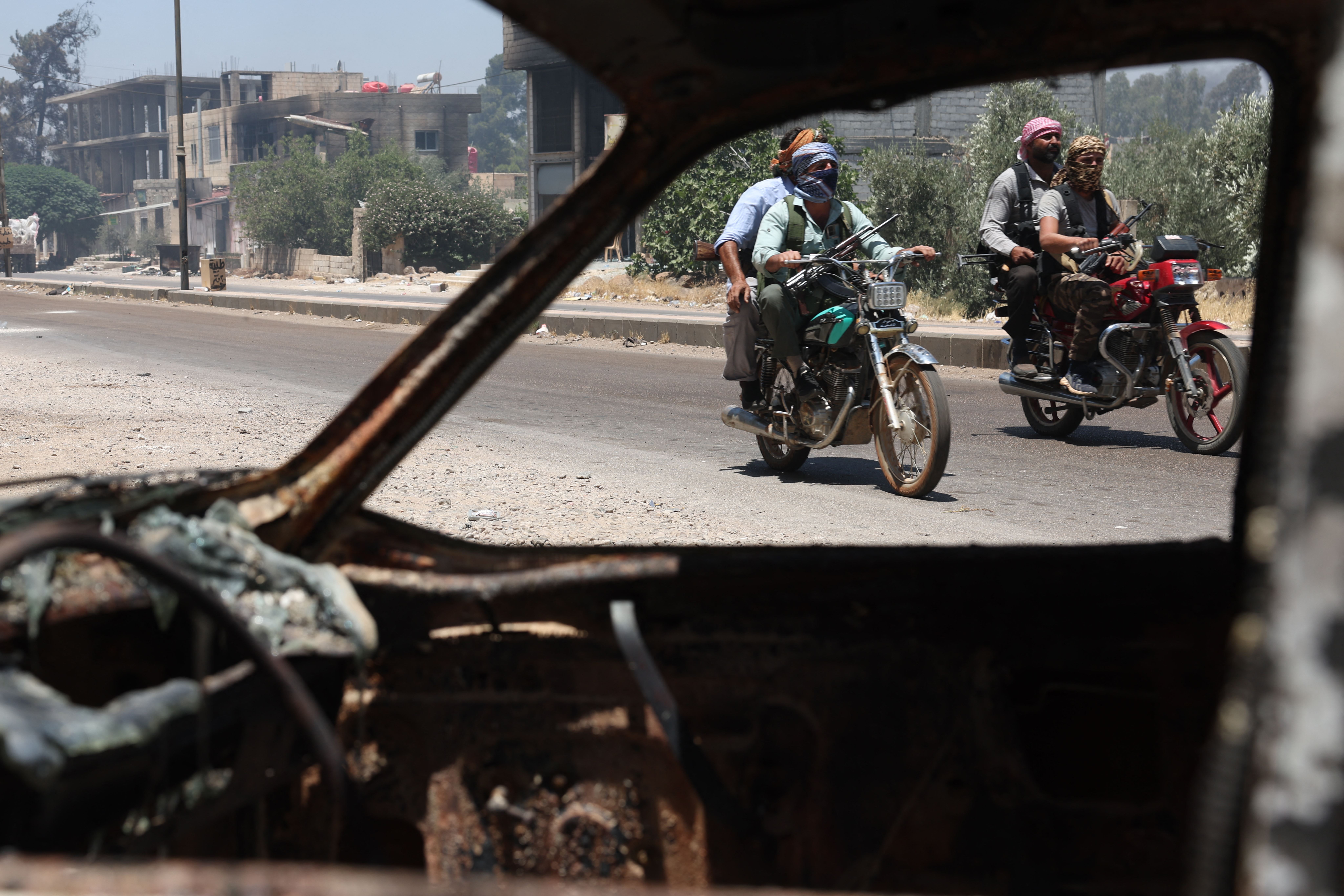 Tribal and bedouin fighters cross the al-Mazraa village in Syria's Suwayda province as they mobilise amid clashes with Druze gunmen on July 18, 2025. Photo: AFP