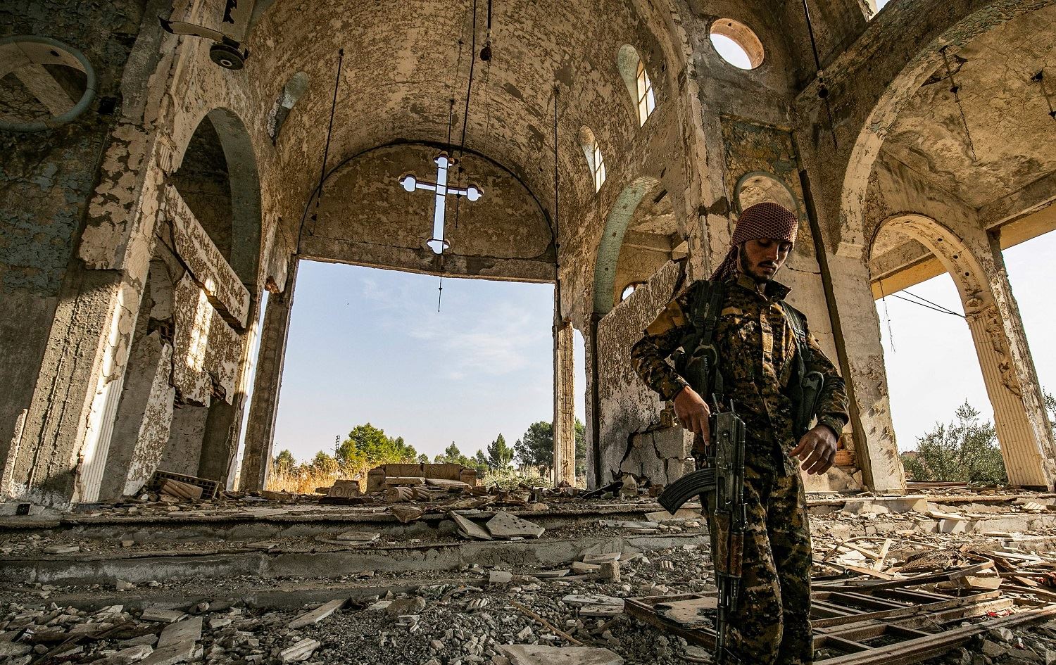 A member of the Khabour Guards (MNK) Assyrian Syrian militia walks in the ruins of the Assyrian Church of the Virgin Mary, destroyed by ISIS in 2015, in Tal Nasri, Hasaka, Syria, November 15, 2019. Photo: Delil Souleiman / AFP