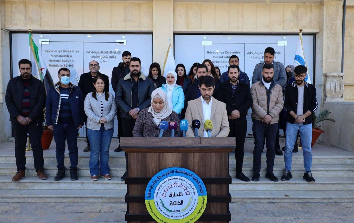 Officials from the Democratic Autonomous Administration of North and East Syria (DAANES) holding a press conference to detail the urgency of the situation in northern Syria's Tishreen Dam on January 20, 2025. Photo: DAANES/Facebook