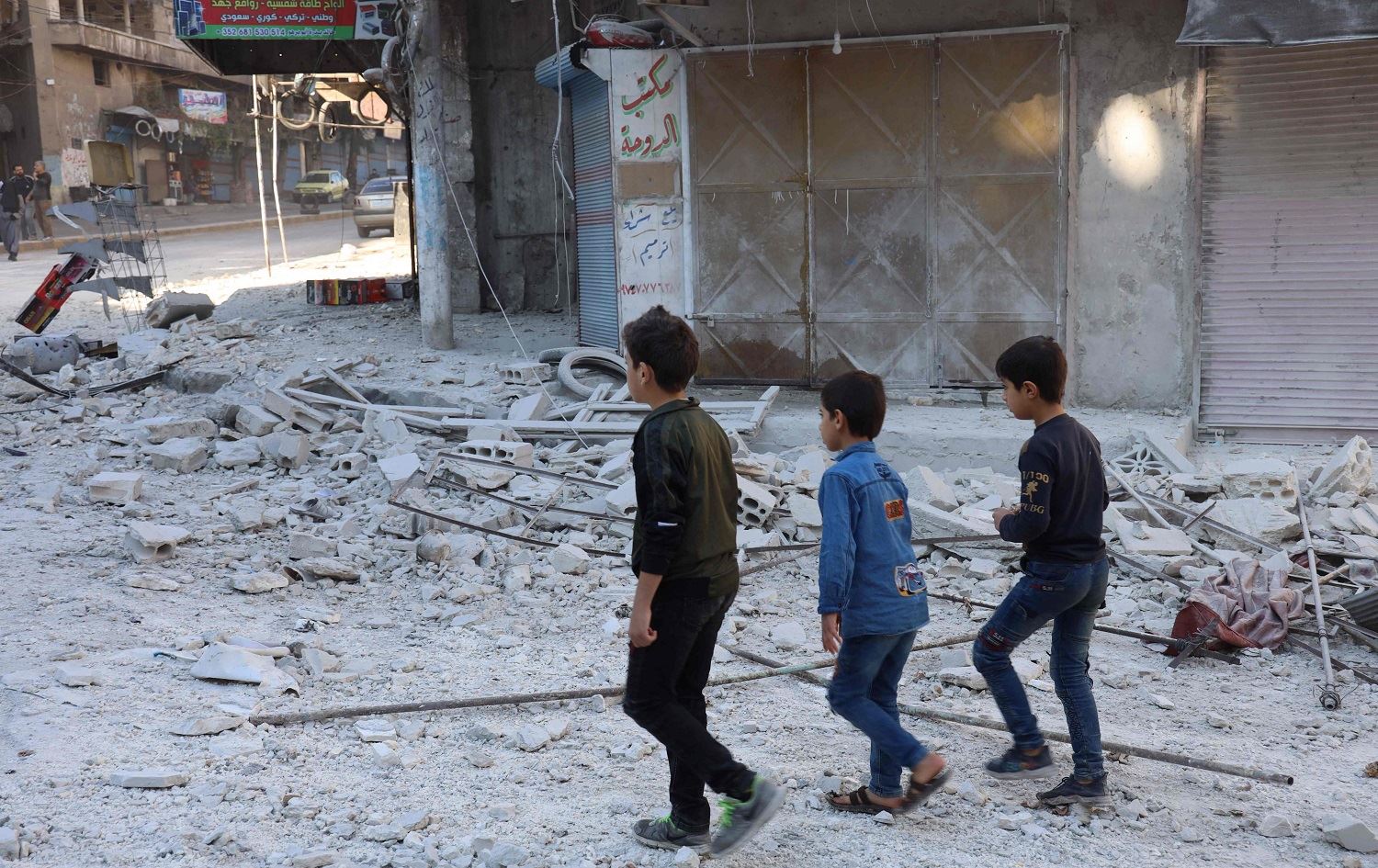 Children walk past debris at the site of shelling in the Syrian town of Ariha in the rebel-held northwestern Syrian Idlib province on October 20, 2021. Photo: Mohammed al-Rifai/AFP