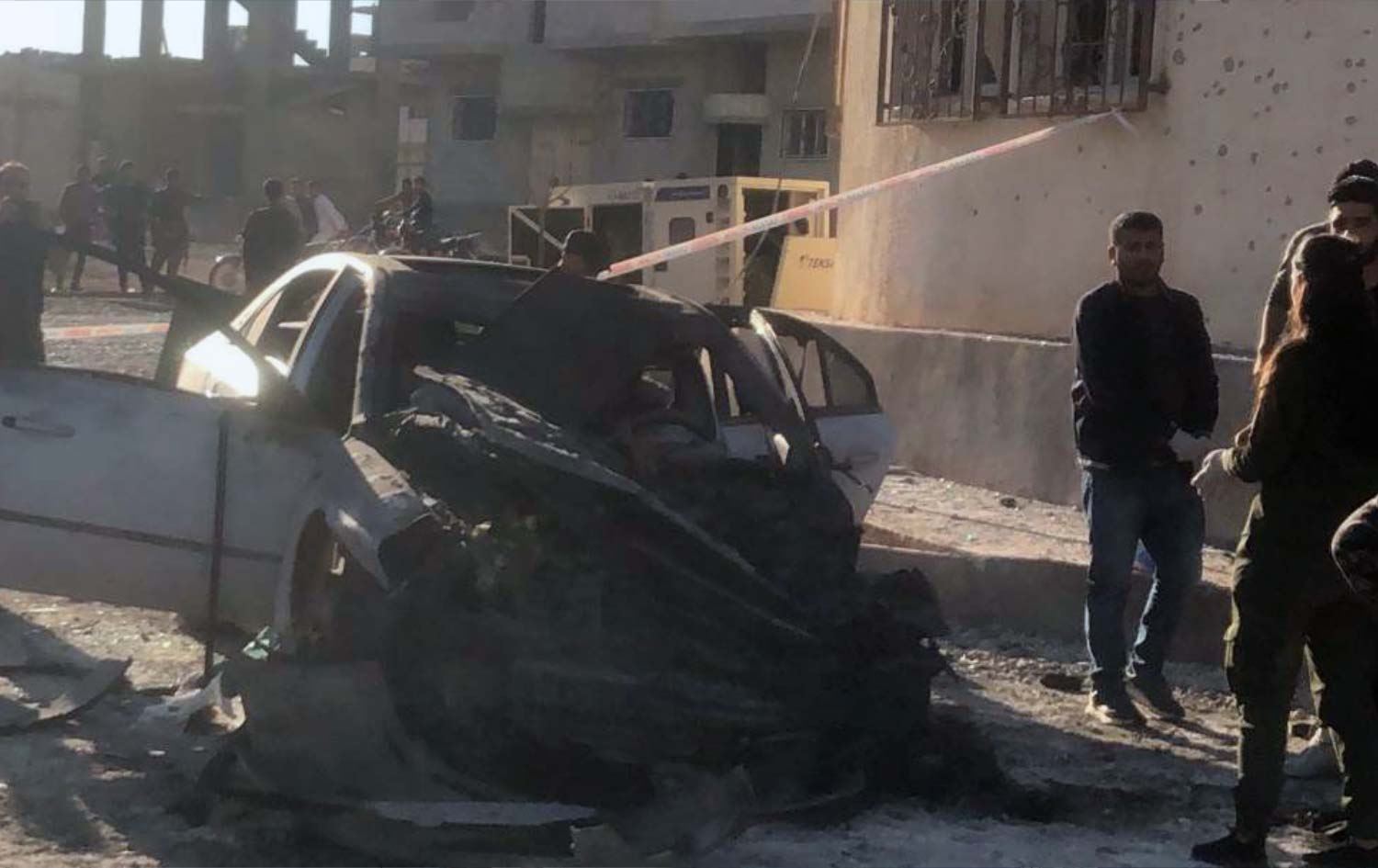 The aftermath of a vehicle targeted by a Turkish drone strike on Wednesday, October 20, 2021 in the Kurdish city of Kobane in northern Syria. Photo: Hawar News Agency