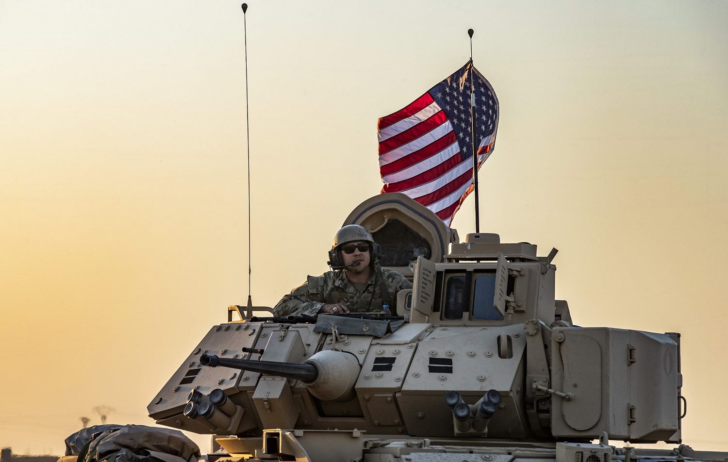 A US soldier sits atop a Bradley armoured personnel carrier as it drives near the town of Tal Tamr in the northeastern Syrian Hasaka province on the border with Turkey, on November 10, 2019. Photo: AFP / Delil Souleiman