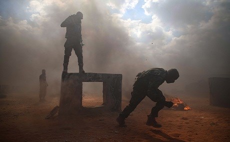 Clutching a rifle to his chest, his back flat against the ground, the 23-year-old shimmies across a dry field in northwestern Syria on his graduation day from training to join an armed rebel group.