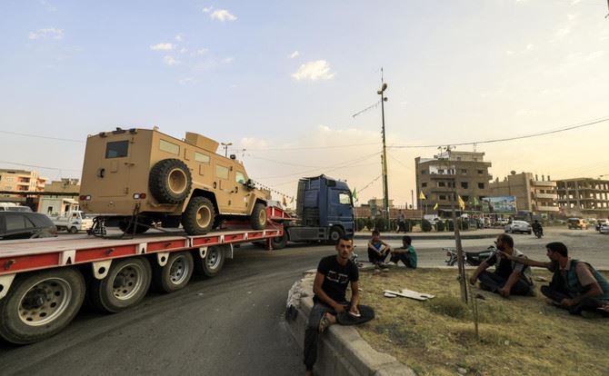 Men watch as a military convoy carrying US-made vehicles, bulldozers, and arms headed for Syrian Democratic Forces (SDF) fighting in Raqqa, passes through the northeastern Syrian city of Qamishli. File Photo: AFP