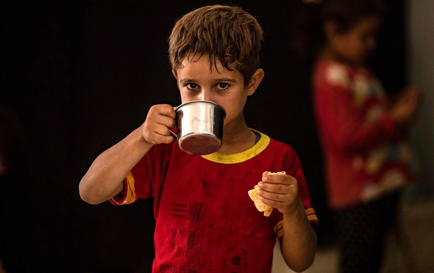 A boy drinks while holding a piece of bread inside a school building where Syrians displaced from Ras al-Ain, a border town controlled by Turkey and its Syrian proxies, are staying in the city of Hasaka on August 20, 2020. Photo: Delil Souleiman/AFP