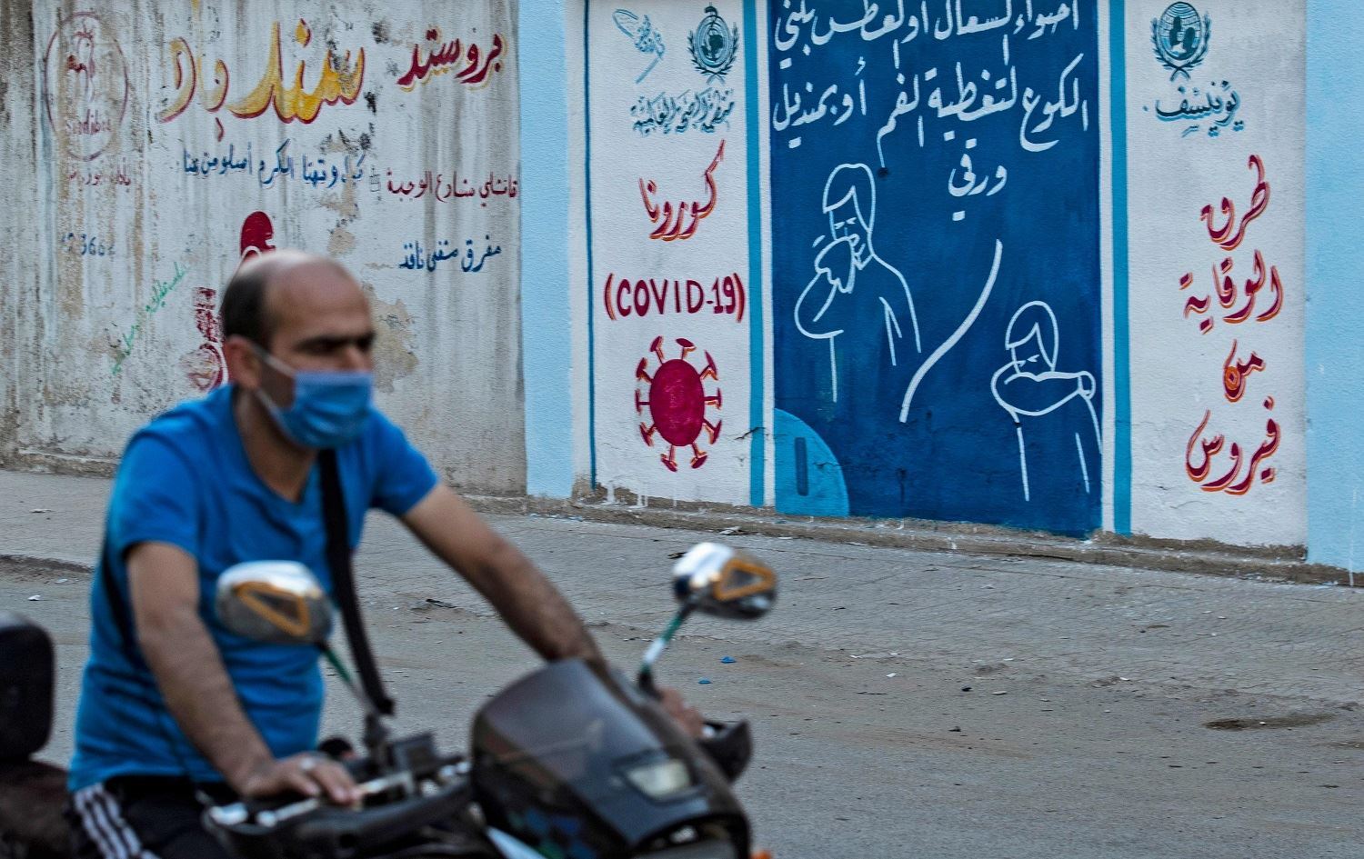 A motorcyclist rides by a mural painted as part of an awareness campaign about the coronavirus in Qamishli in August 2020. File photo: Delil Souleiman/AFP