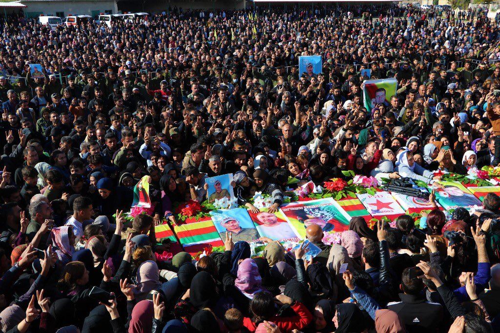 People in Derik, Rojava bury the bodies of 11 people killed by Turkey in its latest attacks. Date: November 21, 2022. Photo: Mazloum Abdi/Twitter