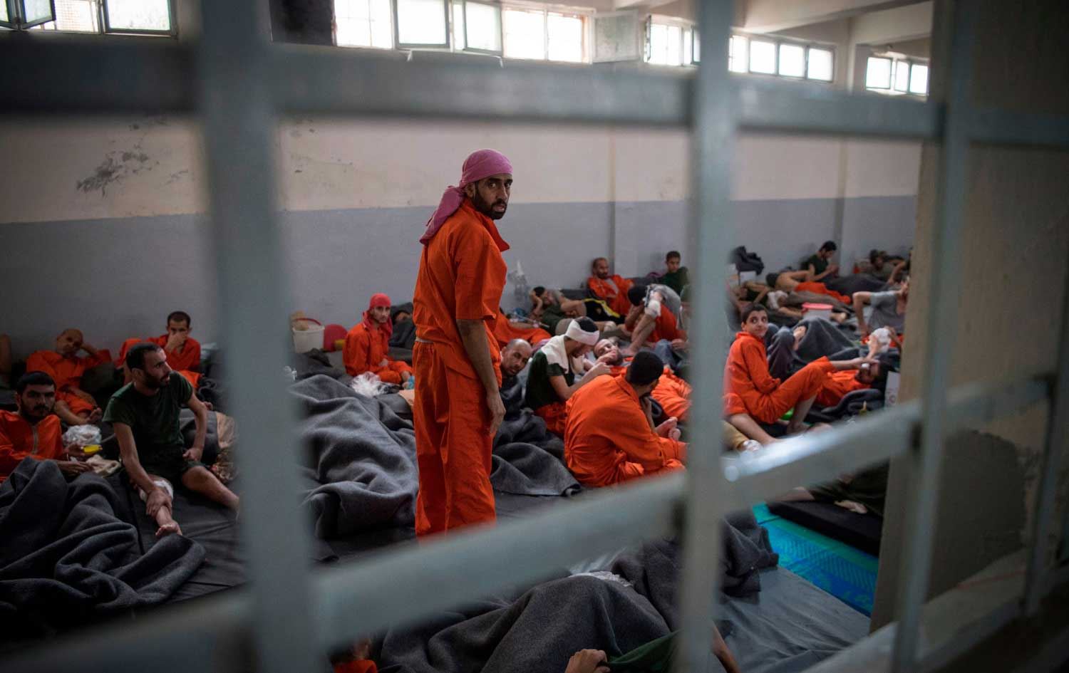 Men allegedly affiliated with ISIS sit on the floor in a prison in the northeastern Syrian city of Hasaka on October 26, 2019. File photo: AFP